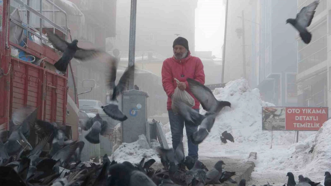 Ardahan’da dondurucu soğuklar etkisini sürdürürken, kar yağışı nedeniyle yem bulamayan güvercinleri esnaf besliyor.