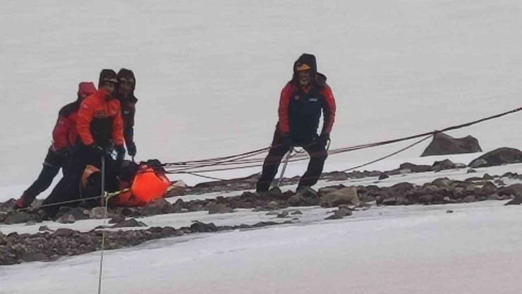Ağrı Dağı’na yaptığı zirve tırmanışının ardından donarak hayatını kaybeden iki dağcının cesetleri zor şartlar altında 4 bin 200 rakımdaki kampa taşınıyor.
