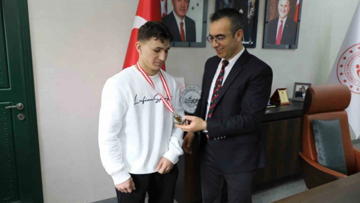 Din, başarılı sporcuya spor çantası hediye ederek, başarılarının devamını diledi. Ziyarette Spor Hizmetleri Müdürü Cemil Budak da hazır bulundu.