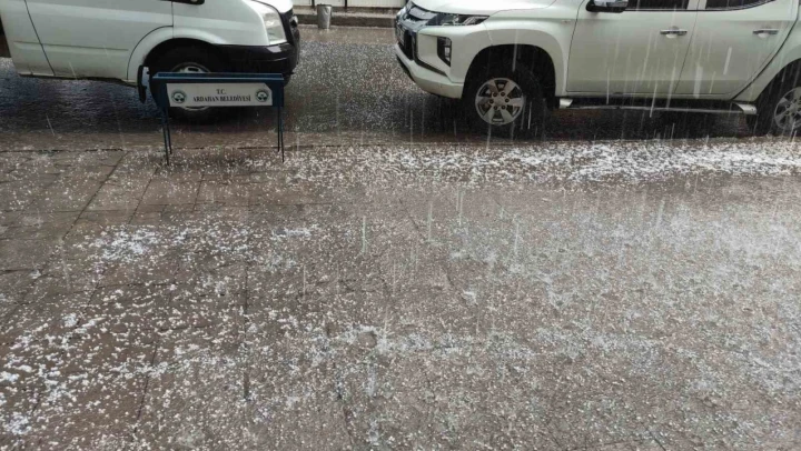 Ardahan'da etkili olan sağanak ve dolu, kenti beyaza bürüdü.
