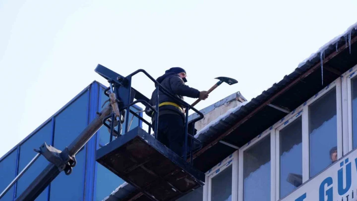 Erzurum'da kar yağışının ardından çatılarda oluşan kar kütleleri ve buz sarkıtları Büyükşehir Belediyesi itfaiye ekipleri tarafından kırılıyor.