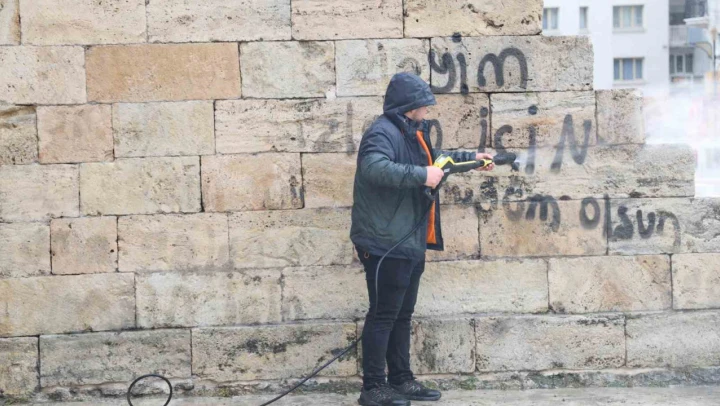 Sivas'ın simgelerinden biri olan 752 yıllık tarihi Çifte Minareli Medrese'nin üzerine yazılan yazılar, boya çürütme tekniği ile temizlendi.