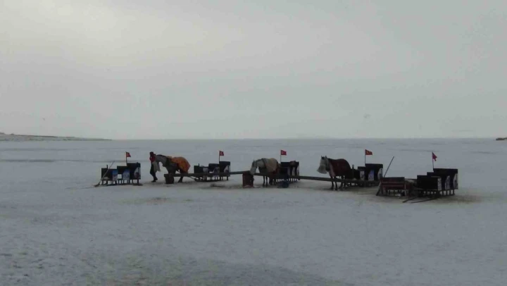 Kars'ta yüzeyi tamamen buzla kaplanan Çıldır Gölü'nde kızakları çeken atları soğuktan korumak için üzerlerine battaniye örtülüyor.