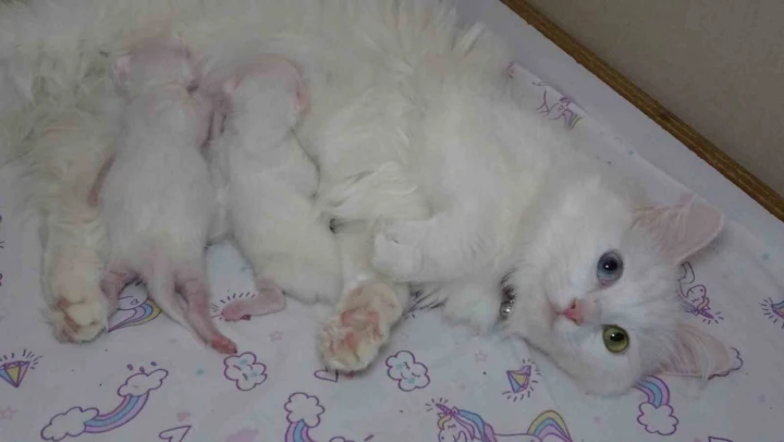Van'da 2022 yılında düzenlenen 'Van Kedisi Güzellik Yarışması'nda birinci olan ve daha önce iki kez anne olan 'Mia' isimli kedi, bu yıl da birbirinden güzel 2 yavru daha doğurdu.