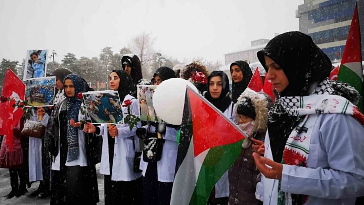 Erzurum'da yoğun kar yağışına rağmen Havuzbaşı Kent meydanında toplanan hekimler ve sağlık çalışanları, Filistin'de yaşanan drama dikkat çekerek İsrail'i kınadı.