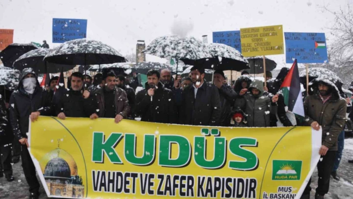 Cuma namazı sonrası Belediye Meydanı'nda toplanan kalabalık sloganlar atarak İsrail'e tepki gösterdi. Yoğun kar yağışının altında açıklama yapan HÜDA PAR İl Başkanı Mehmet Şirin Çağlayan, Gazze'de 77 gün içerisinde 20 bini aşkın sivilin şehit edildiğini ve bunların 8 binden fazlasının çocuk, 6 bin 200'ünün de kadınlardan oluştuğunu söyledi. 77 gündür Gazze'de bir soykırım yaşandığını söyleyen Başkan Çağlayan, 'Diğer taraftan yüzde 70'i kadın ve çocuk olmak üzere 7 bin kardeşimiz de kayıp durumda. Kayıp olanların da şehit olduğu değerlendiriliyor. Allah kardeşlerimize rahmet eylesin ve şehadetlerini kabul etsin. Siyonist terör örgütü İsrail sivillerle birlikte insani görevlerini yapmaya çalışan insanlığın hizmetkrlarını da hedef alıyor. 7 Ekim'den bu yana 200'den fazla doktor, 97 gazeteci, 35 sivil savunma görevlisi ve yine yüzlerce sağlık çalışanı şehit edildi. Yine 10 binlerce kardeşimiz yaralandı. Yıkılan binalardan ve tahrip edilen altyapıdan, temiz su ve gıdaya erişememekten dolayı salgın hastalıklar baş göstermeye başladı. Yüz binlerce kardeşimiz de hasta durumdadır. Dünyanın gözleri önünde savaş suçu işleyen terör şebekesi, 53 hastaneyi, 102 ambulansı, 312 camiyi, 3 kiliseyi, 282 okul ve üniversiteyi ve 306 bin konutu kısmen veya tamamen tahrip etti. Altyapı tahrip edildi, un fabrikaları, ekmek fırınları, su depoları, yardım taşıyan kamyonlar bombalandı. Bütün bu cürümlere rağmen onları destekleyen batı dünyası tavrını değiştirmedi, desteğini çekmedi ve 'İsrail'in kendisini savunma hakkı vardır' söylemiyle bu suçları meşrulaştırmaya çalıştı. Oysa Siyonist terör örgütü İsrail ve destekçisi batılı ülkelerin Gazze'de yaptıkları bir savunma değildir. Vahşettir, katliamdır ve soykırımdır. Dünyada ve uluslararası metinlerde savaş suçu ve insanlığa karşı suç olarak tarif edilen fiillerin tamamı bu katiller sürüsü tarafından işlenmiştir' diye konuştu.