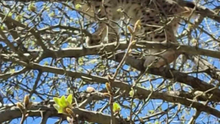Sivas'ın Hafik ilçesinde, ormanın hayaleti olarak adlandırılan bir vaşak, köpeklerin saldırısından korunmak için tırmandığı ağaca sığındı