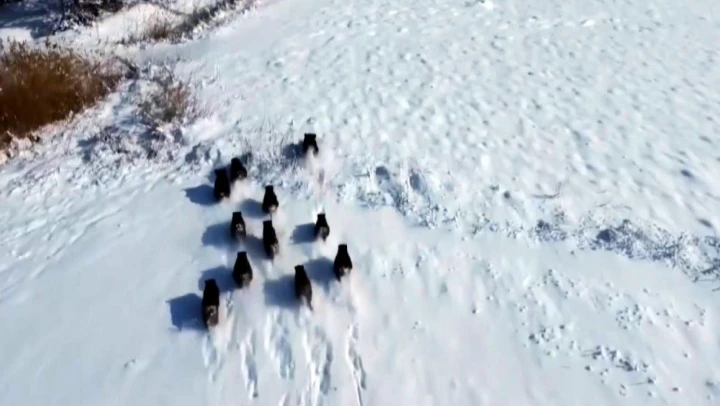 Erzincan'da popülasyonu artan ve yaz aylarında çiftçilerin mahsullerine zarar verdiği için dert yakındıkları domuz sürüsü karla kaplı arazide havadan dron kamera ile görüntülendi.