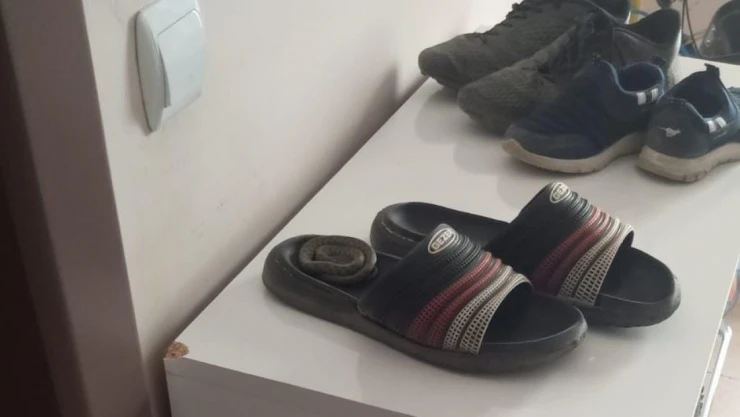 Elazığ'da bir apartman dairesinin önünde bulunan ayakkabılığın üzerindeki terlikten yılan çıktı.