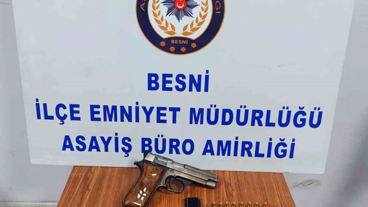 Besni İlçe Emniyet Müdürlüğü ekipleri, Dumlupınar Mahallesi Atatürk Caddesi üzerinde şüphe üzerine durdurulan araçta arama yaptı. Aramada 1 adet tabanca, 8 adet mermi ele geçirildi.