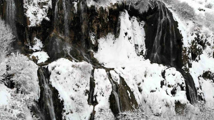 Kısmen donması nedeniyle buz sarkıtlarının da oluştuğu şelalenin beyaz örtüyle bütünleşmesiyle kartpostallık manzaralar oluştu.