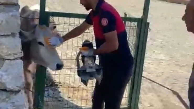 Bingöl'de demir kapıya sıkışan inek kurtarıldı