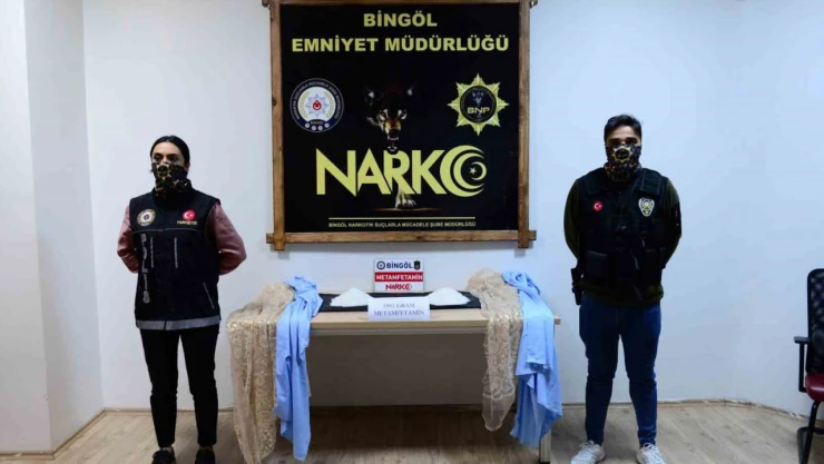 Bingöl İl Emniyet Müdürlüğüne bağlı Narkotik Suçlarla Mücadele Şube Müdürlüğü ekipleri, uyuşturucu madde imal ve ticaretini önlemek amacıyla çalışma gerçekleştirdi. Kentte, Doğu illerinden gelen kargo firmaları aracılığıyla uyuşturucu madde sevkiyatı yapılacağı yönünde istihbarat alınması üzerine kargo firmaları çevresinde tertibat alındı. Bir şüpheli üzerinde yapılan çalışmada, kargo poşetine konulan perdelerin arasına saklanmış vaziyette 1 kilo 981 gram metamfetamin ele geçirildi.