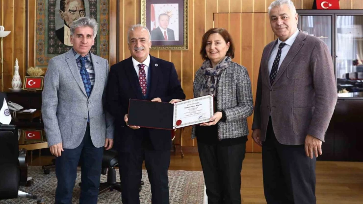 Ziraat Fakültesi Tarım Makineleri ve Teknolojileri Bölümünün akredite edilmesi ve Su Ürünleri Mühendisliği Programının değerlendirme sürecinde olması hasebiyle Rektör Prof. Dr. Ömer Çomaklı’yı ziyaret eden ZİDEK Değerlendirme Takımı Başkanı Prof. Dr. Canan Abay, Ziraat Fakültesi Tarım Makineleri ve Teknolojileri Bölümünün Akreditasyon belgesini Rektör Çomaklı’ya takdim etti.