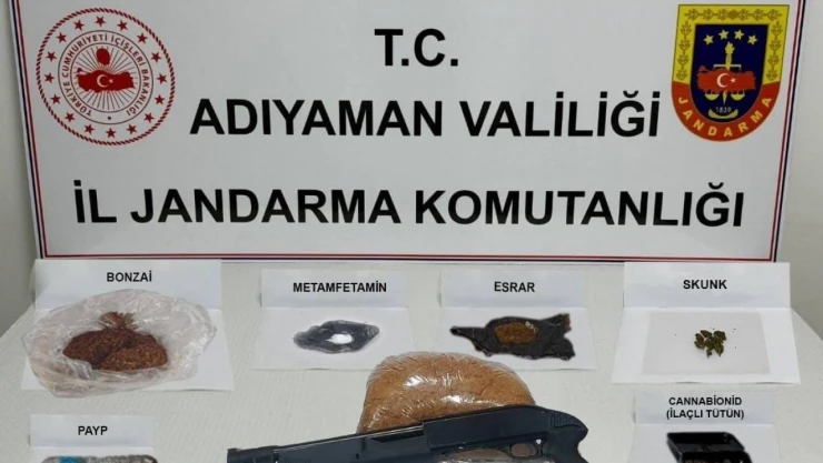 Adıyaman İl Jandarma Komutanlığı ekiplerince uyuşturucuyla mücadele çalışmaları çerçevesinde durumundan şüphelenen şahıslar üzerinde yapılan incelemelerde 2 kilo 485 gram bonzai, 22 gram metamfetamin, 9 gram kubar esrar, 4 gram skunk, 3 adet galara, 4 adet uyuşturucu kullanma aparatı 1 litre 300 ml aseton ve 1 adet ruhsatsız av tüfeği ele geçirildi. Uyuşturucu maddeleri muhafaza altına alınırken toplam 30 şahıs hakkında ise işlem yapıldı.