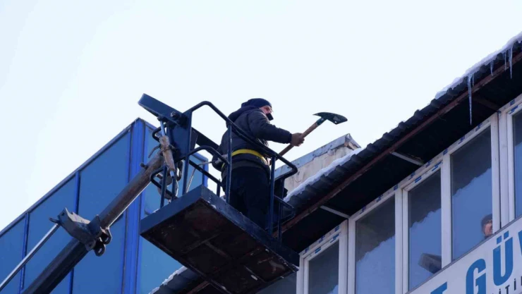 Büyükşehir Belediyesi bünyesinde kurulan ’buz kırma timi’ hem gelen ihbarlara gidiyor hem de şehrin kritik yerlerinde tespit edilen binalarda buzla mücadele ediyor. Vinçle ev ve iş yerlerinin saçaklarında oluşan buzları kazma ve küreklerle kıran tim, gün boyu gelen ihbarları değerlendiriyor.