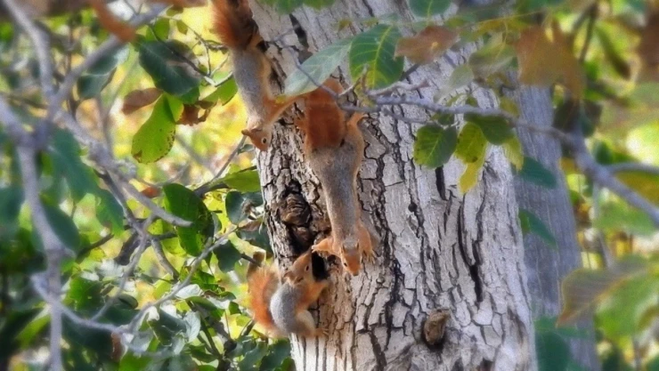 Erzincan’ın Çağlayan Beldesinde ceviz ağacına yuva kuran 3 kişilik sincap ailesinin mutlu halleri görüntülendi.
