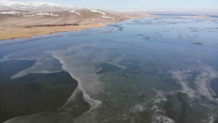 Doğu Anadolu Bölgesi`nin Van Gölü`nden sonra 2’inci büyük gölü olan Çıldır Gölü`nün yüzeyi soğuk hava nedeniyle kısmen dondu.