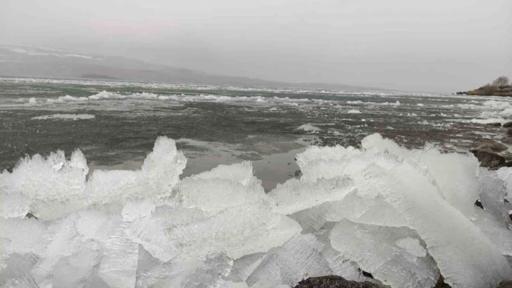 Ardahan'da Çıldır Gölü'nün yüzeyini kaplayan buz tabakası sıcak havanın etkisiyle erimeye başladı. Ortaya kutupları aratmayan görüntüler çıktı.