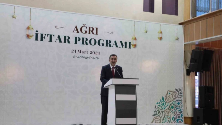 Ağrı’da Hakemoğlu Konferans Salonu’na düzenlenen iftar programına katılan Cumhurbaşkanı Yardımcısı Cevdet Yılmaz yaptığı konuşmada, “Peygamber Efendimizin kutlu emrine ram olarak iki günümüzü birbirine eşit geçirmemek için hep canla başla, aşkla çalışıyoruz. 10 Ramazan, sizler gibi kardeşlerimizle buluştuğumuz iftar sofralarında daha bir anlam kazanıyor. Bu bölgenin bir evladı olarak bir önceki haftadan bu yana ya bölgede bir şehrimizde ya da hemşehri buluşmalarında iftar sevincini paylaşıyoruz. Tüm illerimize yüzümüz, alnımız ak şekilde gidiyoruz. İktidardaki 21 yıllık eser ve hizmet yolculuğumuzda daha önce hayal dahi edilemeyen nice yatırımı, eseri ve projeyi ülkemize kazandırdık. Ülkemizin eksiklerini gidermekle kalmadık, her alanda Türkiye’yi tarihinin en büyük kalkınma ve yatırım hamlesiyle tanıştırdık” dedi.