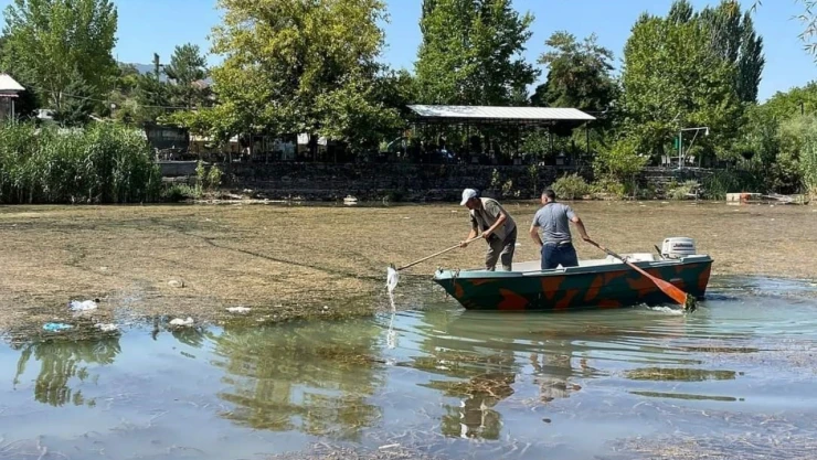 Adıyaman’ın Gölbaşı ilçesinde doğa koruma ekipleri tarafından göl yüzeyinde biriken çöpler temizleniyor.