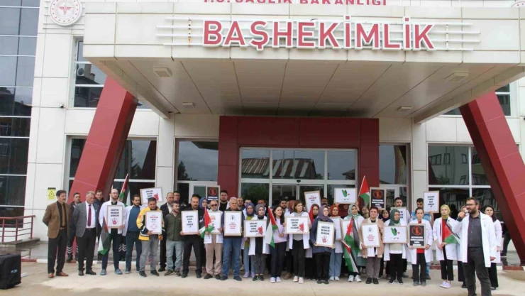 Suşehri Devlet Hastanesi çalışanları, İsrail'in Gazze halkına yaptığı katliamlara dikkat çekmek amacıyla hastane önünde toplanıp bildiri okuyarak, açılan dövizlerle Gazze halkına destek verdiler.