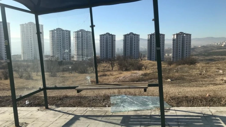 Elazığ’da şehir magandaları belediyeye ait otobüs durağının camlarını kırdı.