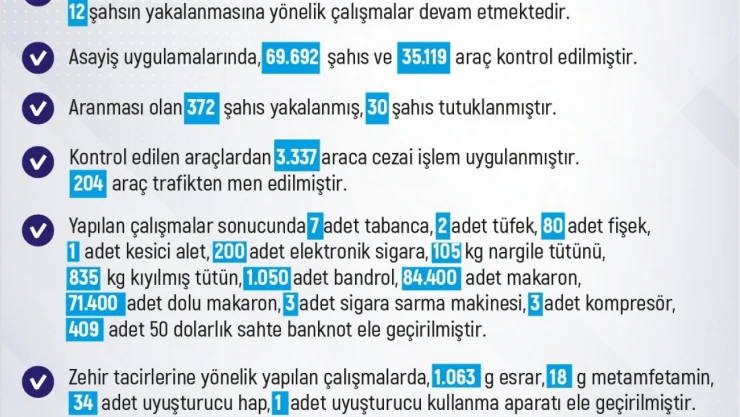 Elazığ Valiliği, kentte son bir haftada meydana gelen olaylara ilişkin açıklama yaptı. Valilikten yapılan açıklamada, ’’İlimiz emniyet ve jandarma bölgesinde 30 Eylül 6 Ekim tarihleri arasında meydana gelen 236 olayda, 226 şahıs yakalanmış, 14 şahıs tutuklanmış, 12 şahsın yakalanmasına yönelik çalışmalar devam etmektedir. Asayiş uygulamalarında 69 bin 692 şahıs ve 35 bin 119 araç kontrol edilmiştir. Aranması olan 372 şahıs yakalanmış, 30 şahıs tutuklanmıştır. Kontrol edilen araçlardan 13 bin 337 araca cezai işlem uygulanmıştır. 204 araç trafikten men edilmiştir. Yapılan çalışmalar sonucunda 7 adet tabanca, 2 adet tüfek, 80 adet fişek, 1 adet kesici alet, 200 adet elektronik sigara, 105 kilo nargile tütünü, 835 kilo kıyılmış tütün, bin 50 adet bandrol, 84 bin 400 adet makaron, 71 bin 400 adet dolu makaron, 3 adet sigara sarma makinesi, 3 adet kompresör, 409 adet 50 dolarlık sahte banknot ele geçirilmiştir. Zehir tacirlerine yönelik yapılan çalışmalarda, 1 kilo 63 gram esrar, 18 gram metamfetamin, 34 adet uyuşturucu hap, 1 adet uyuşturucu kullanma aparatı ele geçirilmiştir. İlimizde 35 trafik kazası meydana gelmiştir, 61 kişi yaralanmıştır. Bu sure zarfında kaybolan 7 şahıs, 2 adet motosiklet ve 600 bin lira değerinde elektrik tesisatı malzemesi bulunmuştur’’ denildi.