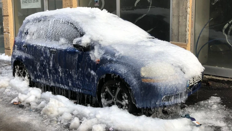 Cumhuriyet Caddesi’nin ara sokaklarının birinde üzerine kar yağan ve daha sonra çatılardan akan suların donması yüzünden neredeyse buzla kaplanan otomotiv görenleri şaşkına çevirdi. Araç sahibinin şehir dışında olması nedeniyle müdahale edilemeyen ve yerinden de kaldırılmayan aracın üstünün neredeyse tamamı buzla kaplandı.
