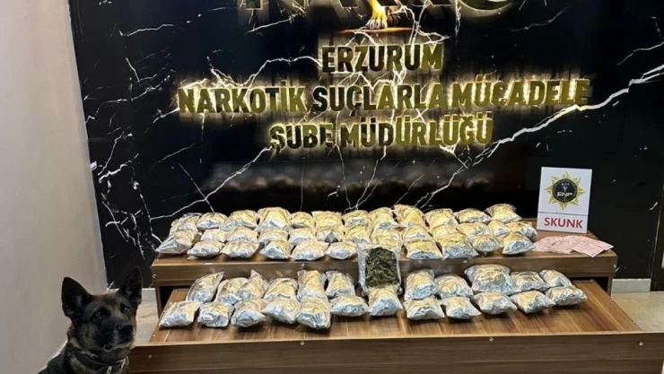 Erzurum Emniyet Müdürlüğü Narkotik Suçlarla Mücadele Şube Müdürlüğü ekipleri tarafından yapılan operasyonda Narkotik Arama Köpeği Su 6 kilo 975 gram skunk maddesi yakaladı.