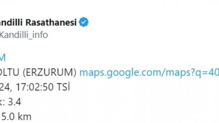 Kandilli Rasathanesi, Erzurum’un Oltu ilçesinde 3.4 büyüklüğünde bir deprem meydana geldiğini paylaştı. Tutlu Mevkiindeki depremin 5 kilometre derinlikte gerçekleştiği bildirildi. Alınan bilgilere göre bölgede her hangi bir yaralama veya can kaybı olmadı. AFAD bölgede incelemelerini sürdürüyor.