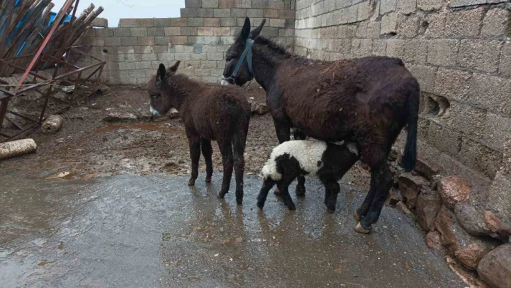 İlginç olay, Adıyaman’ın Besni ilçesine bağlı Tilek köyünde yaşandı. İbrahim Yakut’un koyunlarından birisi ikiz doğurdu. Kuzunun anne sütü yetmeyince, doğum yapan eşeğin sütünden emmeye başladı. Kuzuya eşek annelik yapıyor. Eşek hem kendi yavrusunu hem de kuzuyu emziriyor.