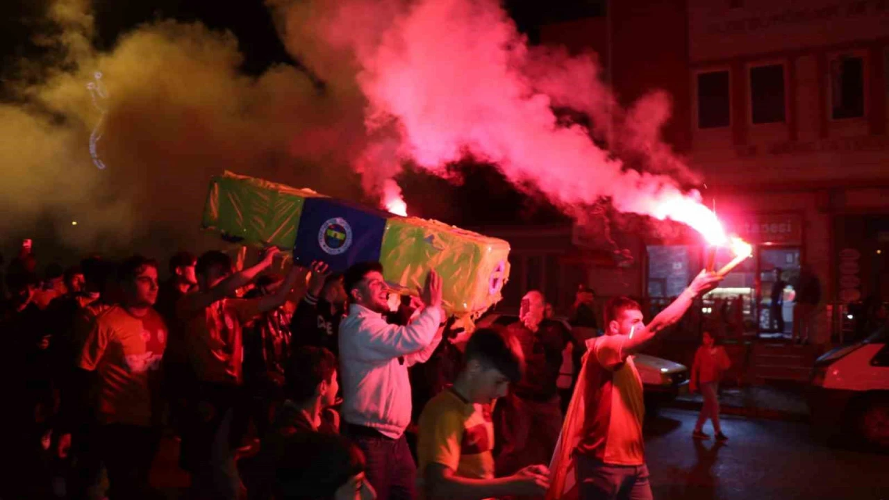 Galatasaray taraftarları, Fenerbahçe’nin kartondan tabutunu yaparak Oltu Kalesi Meydanı’nda bulunan Tesbih Heykeli’nin tepesine çıkardılar. Daha sonra tabutu omuzlarına alarak Oltu caddelerinde tur attılar. Araçlarla konvoylar trafiği kitleme noktasına getirdi.
