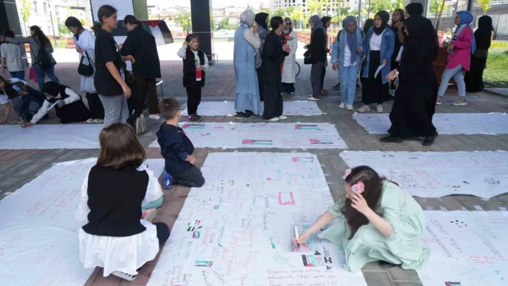 Etkinliğe katılanlar yazdıkları mesajlarla Filistin’e olan desteklerini ve İsrail’in saldırılarına karşı tepkilerini dile getirdiler.