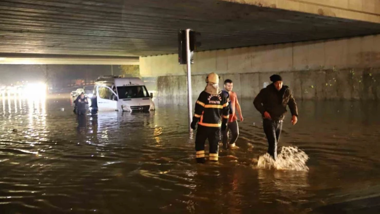 Gaziantep’te etkili olan sağanak nedeniyle sular altında kalan köprülü kavşakta 1’i işçi servisi olmak üzere toplam 5 araç mahsur kaldı. Araçların içerisinde çaresizce bekleyen vatandaşlar ise olay yerine gelen ekiplerin çalışması sonucu kurtarıldı. Sulara gömülen işçi servisi şoförü ise 45 dakika süren ikna çalışmaları sonucu aracını terk etti.