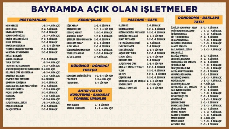 Kurban Bayramı tatili süresince Gaziantep’te bulunacak vatandaşlar ve şehir dışından gelen yerli ve yabancı misafirler için hizmet verecek işletmeler belirlendi.