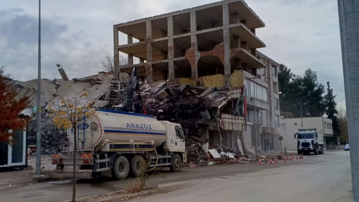 Kahramanmaraş merkezli 6 Şubat’taki depremlerden etkilenen 11 il arasında yer alan Adıyaman’ın Gölbaşı ilçesinde ağır hasarlı binaların yıkımı tek tek yapılıyor. İlçe merkezindeki Cumhuriyet Mahallesi Gazi Caddesi üzerinde bulunan 5 katlı binanın yıkımı gerçekleştirildi. Ekipler, çevresinde önlem aldığı ağır hasarlı bina iş makineleriyle kontrollü yıkılıyor. Kamyonlara yüklenen molozlar enkaz döküm alanlarına taşınıyor. Öte yandan yıkım esnasında toz olmaması için sulama işlemleri de gerçekleştiriliyor.