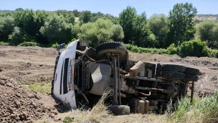 Adıyaman’ın Gölbaşı ilçesinde dorsesinde bulunan yükü boşaltan kamyon şarampole devrildi.