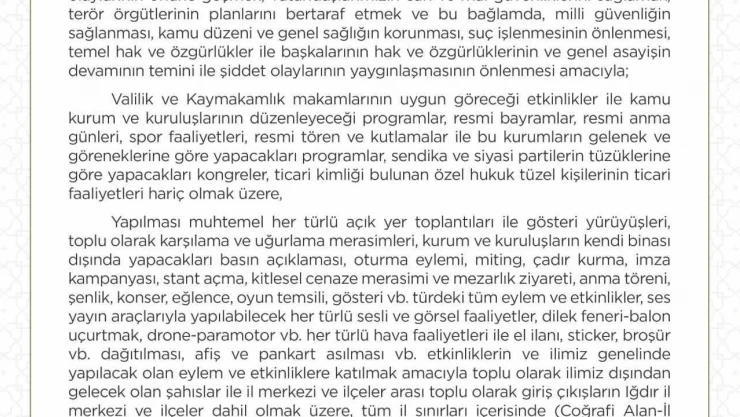Valilik tarafından yapılan açıklamada; ”Anayasamızda ve kanunlarda öngörülen sınırlandırma ve yasaklama şartlarını doğrudan ve açıkça oluşturduğu değerlendirilen eylemler ile saldırı olaylarının önüne geçmek, vatandaşlarımızın can ve mal güvenliklerini sağlamak, terör örgütlerinin planlarını bertaraf etmek ve bu bağlamda, milli güvenliğin sağlanması, kamu düzeni ve genel sağlığın korunması, suç işlenmesinin önlenmesi, temel hak ve özgürlükler ile başkalarının hak ve özgürlüklerinin ve genel asayişin devamının temini ile şiddet olaylarının yaygınlaşmasının önlenmesi amacıyla; Valilik ve Kaymakamlık makamlarının uygun göreceği etkinlikler ile kamu kurum ve kuruluşlarının düzenleyeceği programlar, resmi bayramlar, resmi anma günleri, spor faaliyetleri, resmi tören ve kutlamalar ile bu kurumların gelenek ve göreneklerine göre yapacakları programlar, sendika ve siyasi partilerin tüzüklerine göre yapacakları kongreler, ticari kimliği bulunan özel hukuk tüzel kişilerinin ticari faaliyetleri hariç olmak üzere, yapılması muhtemel her türlü açık yer toplantıları ile gösteri yürüyüşleri, toplu olarak karşılama ve uğurlama merasimleri, kurum ve kuruluşların kendi binası dışında yapacakları basın açıklaması, oturma eylemi, miting, çadır kurma, imza kampanyası, stant açma, kitlesel cenaze merasimi ve mezarlık ziyareti, anma töreni, şenlik, konser, eğlence, oyun temsili, gösteri vb. türdeki tüm eylem ve etkinlikler, ses yayın araçlarıyla yapılabilecek her türlü sesli ve görsel faaliyetler, dilek feneri-balon uçurtmak, drone-paramotor vb. her türlü hava faaliyetleri ile el ilanı, sticker, broşür vb. dağıtılması, afiş ve pankart asılması vb. etkinliklerin ve ilimiz genelinde yapılacak olan eylem ve etkinliklere katılmak amacıyla toplu olarak ilimiz dışından gelecek olan şahıslar ile il merkezi ve ilçeler arası toplu olarak giriş çıkışların Iğdır il merkezi ve ilçeler dahil olmak üzere, tüm il sınırları içerisinde (Coğrafi Alan-İl Merkezi, İlçeler, Polis ve Jandarma sorumluluk bölgelerinin tamamı), 2911 sayılı Toplantı ve Gösteri Yürüyüşleri Kanununun 17. ve 19. Maddeleri ile 5442 sayıl İl İdaresi Kanununun 11/A, B ve C maddeleri gereğince (Jandarma bölgesi dahil) il ve ilçe mülki sınırlarımız içerisinde 04.06.2024 günü saat 00.01’den 10.06.2024 günü saat 23.59’a kadar (7) yedi gün süre ile yasaklanmıştır.