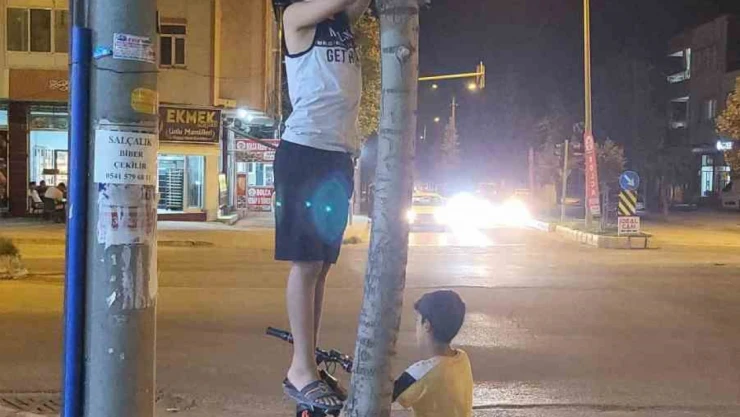 Adıyaman'da ağaçta mahsur kalan yavru kediyi kurtarmak isteyen iki çocuğun mücadelesi kameralara yansıdı.