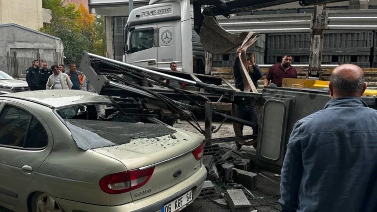 İnşaata Forklift tuğlaları taşırken otomobilin üzerine devrildi