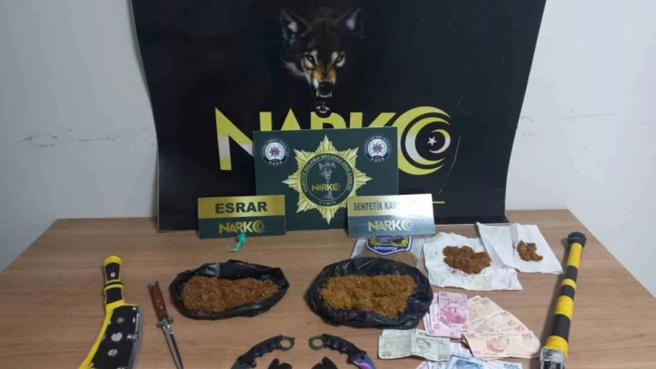 Çeşitli suçlardan kayıtları olduğu tespit edilen şahısların yapılan üst ve ev aramasında 223 gram sentetik kannabinoid (bonzai) maddesi, 1.23 gram esrar, 1 adet çivili jiletli sopa, 2 adet hilal şeklinde bıçak, 1 adet sustalı bıçak, bin 380 TL para ele geçirildi.