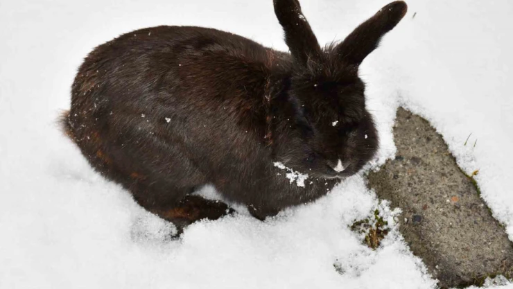 Ardahan’da bir vatandaş tarafından beslenen ve doğada zaman geçirmeleri için kafesinden çıkarılan tavşanlar karın keyfini çıkardı ve beslendi.