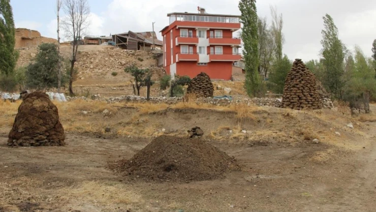 Erzincan'da köyde yaşayan vatandaşlar kış öncesi yakacak için tezekleri hazır etti.