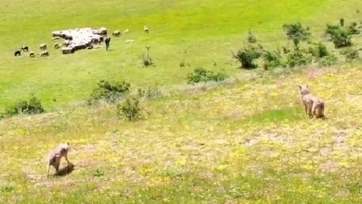 Erzincan'da iki kurt yaylada otlayan koyun sürüsüne, kavalı bırakıp drone ile sürü güden çoban ise kurtlara pusu attı.