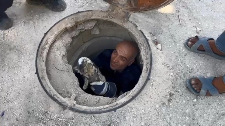 Adıyaman'da, lağım borusu içerisine sıkışan kedi, itfaiye ekipleri tarafından kurtarıldı.