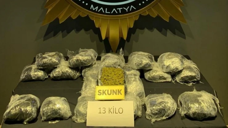 Malatya'da tren istasyonunda bir yolcunun valizinde yapılan aramada 13 kilogram Skunk isimli uyuşturucu madde ele geçirildi. Olayla ilgili 1 şüpheli gözaltına alındı.