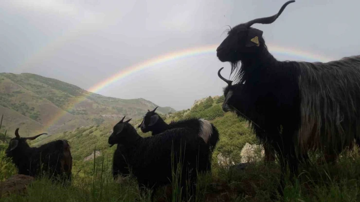 Muş’ta yağmur sonrası ortaya çıkan çift gökkuşağının merada otlayan hayvanlarla bütünleşmesi görsel şölen sundu.