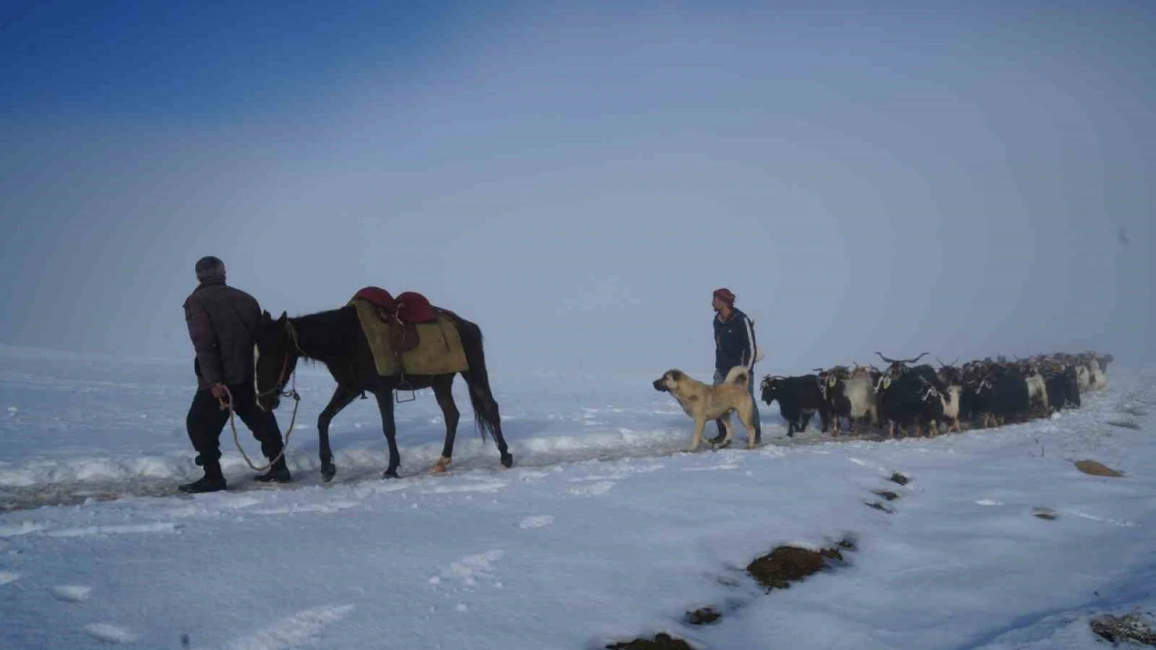 Muş'ta keçi sürüsünün kar üzerinde 4 saatlik zorlu yolculuğu güzel görüntülere sahne oldu
