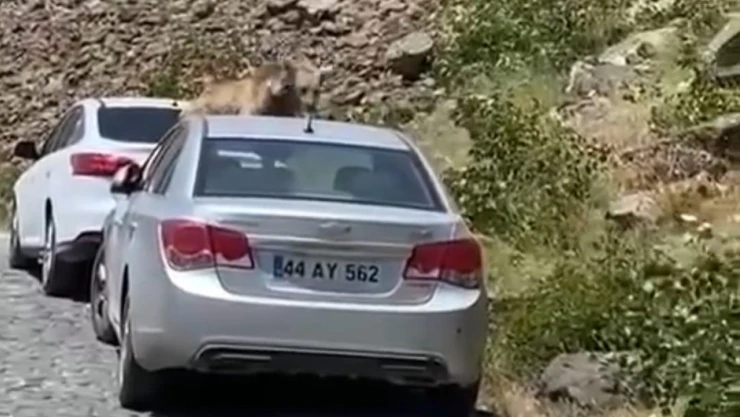 Bitlis’in Tatvan ilçesinde bulunan Nemrut Krater Gölü’nü ziyaret giden vatandaşların arabalarının önünü kesen ayı arabanın üstüne çıktı.
